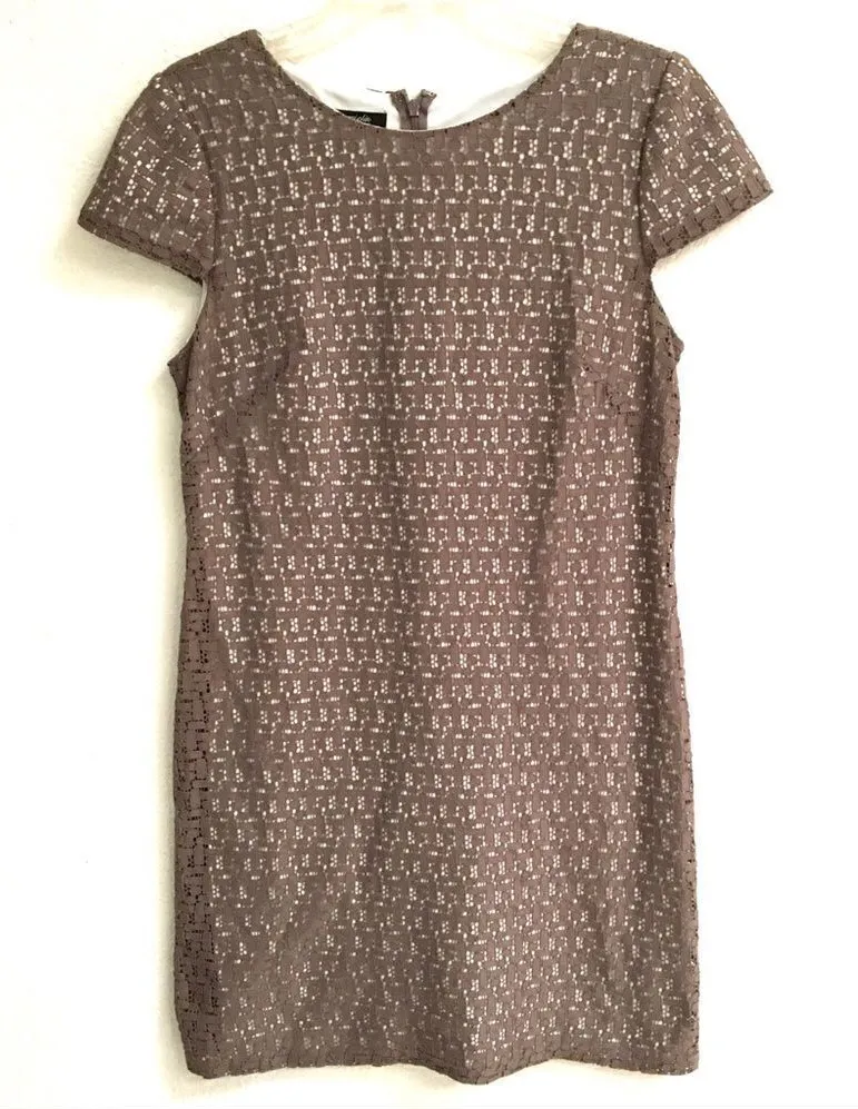 Suzi Chin lace overlay midi shift dress Size 8 Excellent condition color is like a chocolate brown with a cream lining has cap like sleeves hidden zipper in back scoop neck Bust 36 length 36