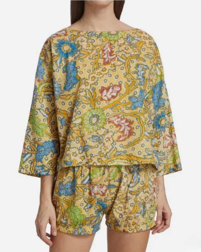 This charming floral print top and shorts set exudes relaxed sophistication. The vibrant pattern com... Show more
