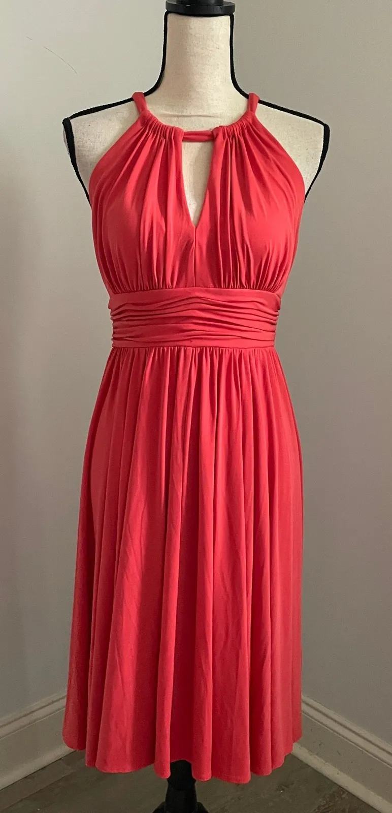 Measurements: • Bust (across): 16 in (stretchy) • Length (shoulder to hem): 39 in Style: Fit & Flare, A-Line Dress Length: Midi Department: Women Sleeve Length: Sleeveless Pattern: Solid Occasion: Party/Cocktail, Wedding, Formal Material: Polyester Blend, Spandex Neckline: Halter Season: Summer Closure: Zip Keywords: Suzy Chin dress, Maggy Boutique dress, coral dress, halterneck dress, keyhole dress, ruched waist dress, midi dress, cocktail dress, wedding guest dress, summer dress, party dress, women's dress, elegant dress, chic dress, formal dress, #mature #vacation #quietluxury #normcore #audreyhepburn #minimalist #classic #elegant #cocktail #event #demure