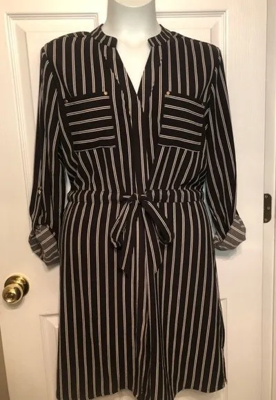 Suzy Shier Black White Striped Shirtdress Sz L Button front Tie waist Roller tab sleeves 96% poly... Show more