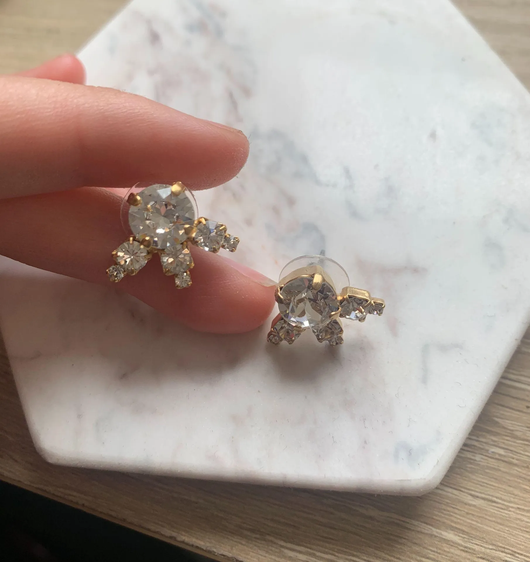 Clear swarovski 8mm cushion cut earrings with shiny gold setting. Setting it’s 100% hypo allergenic.... Show more