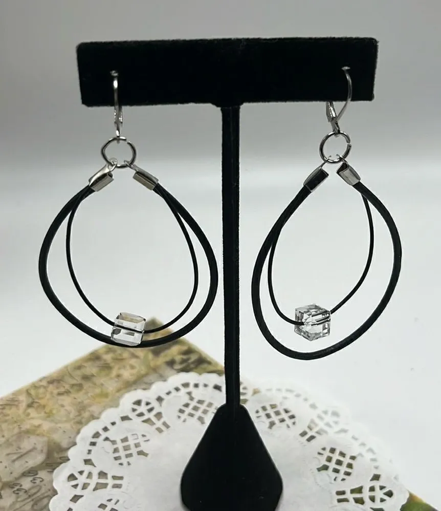 Never worn Lever backs Drop is approx. 3.25 inches Width- 1.75” Crystals are approx. .25” Handmade Swarovski crystals, silver- tone end caps and lever back closure, and two size black leather cords