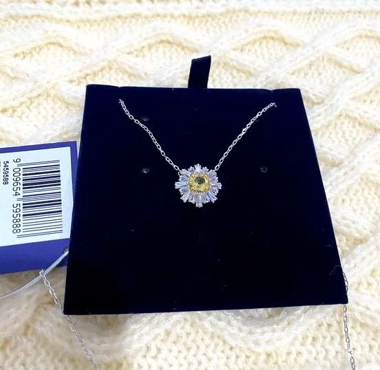 New with the tag and boxes. Inspired by the sun, this elegant pendant radiates warmth and energy. Designed with a yellow center stone framed by rays of clear stones, it is finished with a rhodium plated setting. Style yours solo or with matching pieces from the Sunshine family and wait for the compliments to roll in. Collection: Sunshine Minimum length: 13 3/4 inches Maximum length: 15 3/4 inches Width: 5/8 inches Material: Crystals, Rhodium plated, Zirconia Color: Yellow Clasp type: Lobster