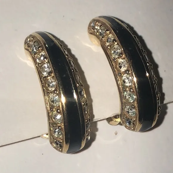 Swarovski Vintage Gold Tone Black Enamel CZ Crystal Retro Boho Clip On Earrings - $50 - From Vault