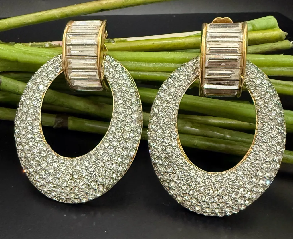 Vintage SAL Swarovski Baguette Pave Crystal Gold tone Door Knocker Clip On Statement Earrings 56.7g.... Show more