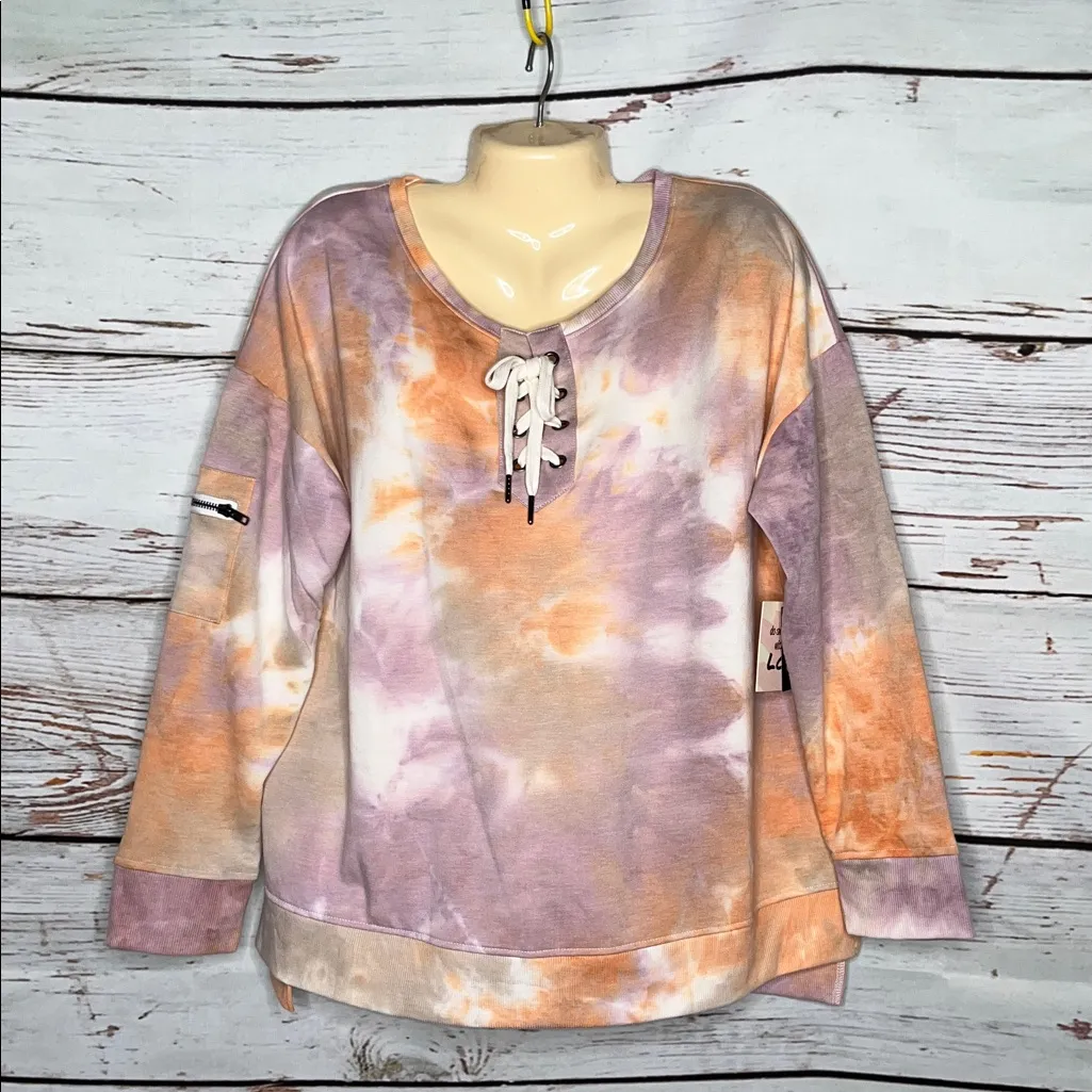 The Sweatshirt Project Size L Purple, Orange, Tan & White Tie Dye Lace-Up Sweatshirt. High-Low Hemline with Side Slits. Long Sleeves with Zipper Pocket. Polyester, Rayon & Spandex Blend. NWT, Brand New with Tags. Length is 26” to 27” & Bust is 23”. Measurements taken while garment is laying flat.