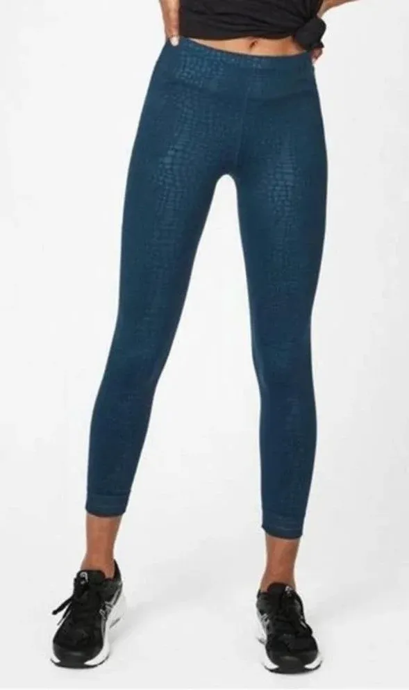 Sweaty Betty All Day Embossed Crocodile Leggings in Blue. Pull on Crocodile print embossed 7/8 length Size US XS 79% polyester & 21% elastane Waist is approx 12" Front rise is approx 8.5" Inseam is approx 24"