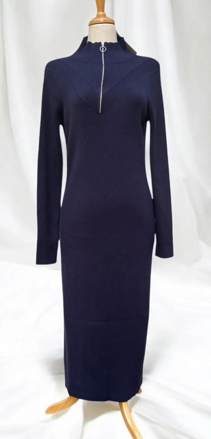 Brand: Sweaty Betty Size: 10 Material: viscose/poly/elastane Color: Navy blue Fit: long sleeve, midi length, zipper collar, mock neck, fitted with stretch Style notes: minimalist, casual, modest, athleisure, cozycore Measurements are approximate and taken lying flat. Pit to Pit 17” Shoulder to bottom hem 45.5” Sleeve length 24” Waist 16” Shoulders across 14.25” Ships from a smoke free pet friendly home. Garment has been cleaned prior to listing. Condition: new with tag. Please see images for exact condition. Color may vary under different lighting conditions. Happy to send more details if requested. Offers always welcome.