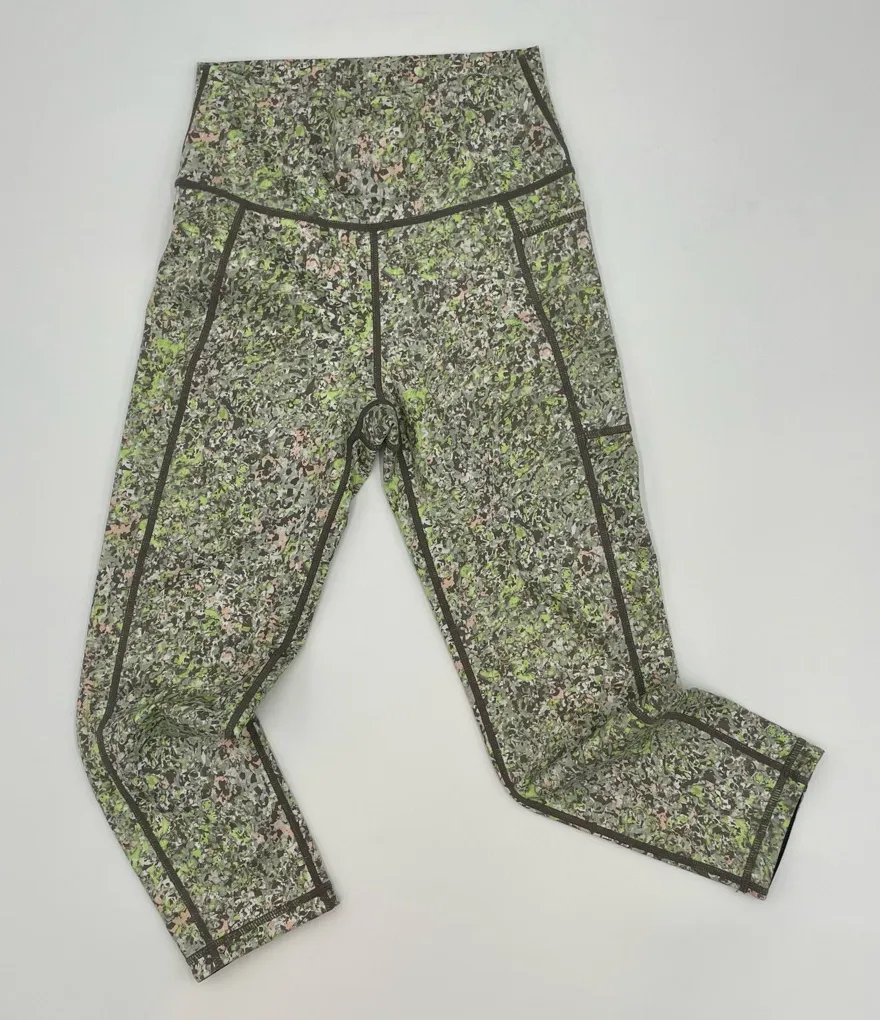 Sweaty Betty TheSuper Sculpt crop leggings in Green Alert Pebble Print. Abstract splatter paint-style design in green, gray, white, and pastel pink. Condition: Gently preloved, no holes or stains. Size: XS. See approximate flat measurements for best fit. Across waist: 11" Front rise: 9.5" Back rise: 13.5" Inseam: 20.5" Cleaned and from a smoke-free home. Fast shipper! Running, yoga, workout, athletic