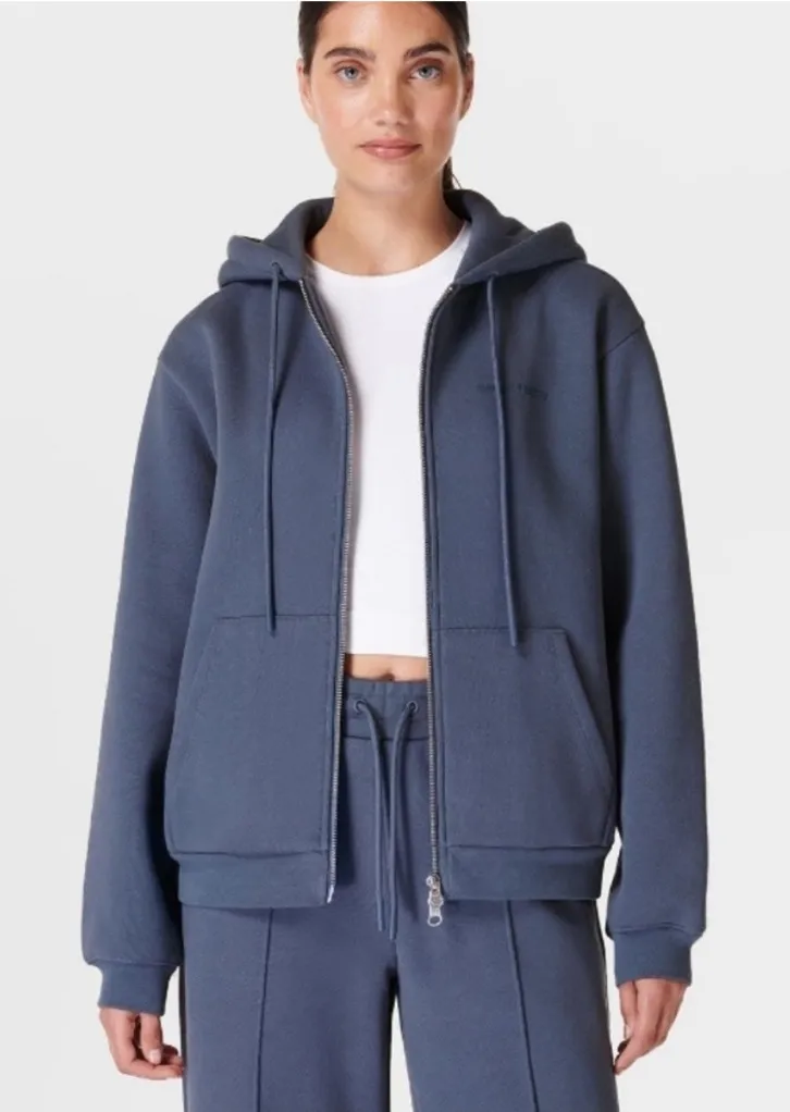 An elevated take on a classic zip-up hoody. The heavyweight brushed-back French terry is made from a soft, breathable cotton blend. Cut to a loose fit with elasticated hem and cuffs, it has an adjustable drawcord at the hood with tonal silicone dipped ends. Matte rubberised branding detail. 65% cotton, 35% polyester Blue color Size Medium