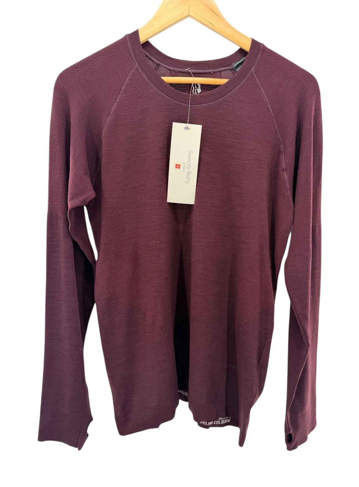 Sweaty Betty Athlete Seamless Workout Top in Black Cherry. This hard-working top is made for every single workout with its lightweight and sweat-wicking fabric. Designed for seamless and high-stretch comfort during all workouts, it features a slim fit with mesh in high sweat areas for enhanced breathability. Perfect for intense gym sessions, outdoor runs, or yoga classes. Measurements: • Chest (pit to pit): 20 in • Sleeve Length (shoulder to cuff): 30 in • Length (shoulder to hem): 26 in Department: Women Type: Casual Style: Pullover Features: Lightweight, Breathable, Stretch, Moisture Wicking Neckline: Crew Neck Performance/Activity: Yoga, Pilates, Running & Jogging, Cross Training Sleeve Length: Long Sleeve Fit: Slim Closure: Pullover Material: 100% Polyamide, Polyamide Pattern: Geometric Keywords: Sweaty Betty, workout top, seamless, athletic, performance, moisture wicking, long sleeve, athleisure, fitness, training, sportswear, breathable, stretch, active top