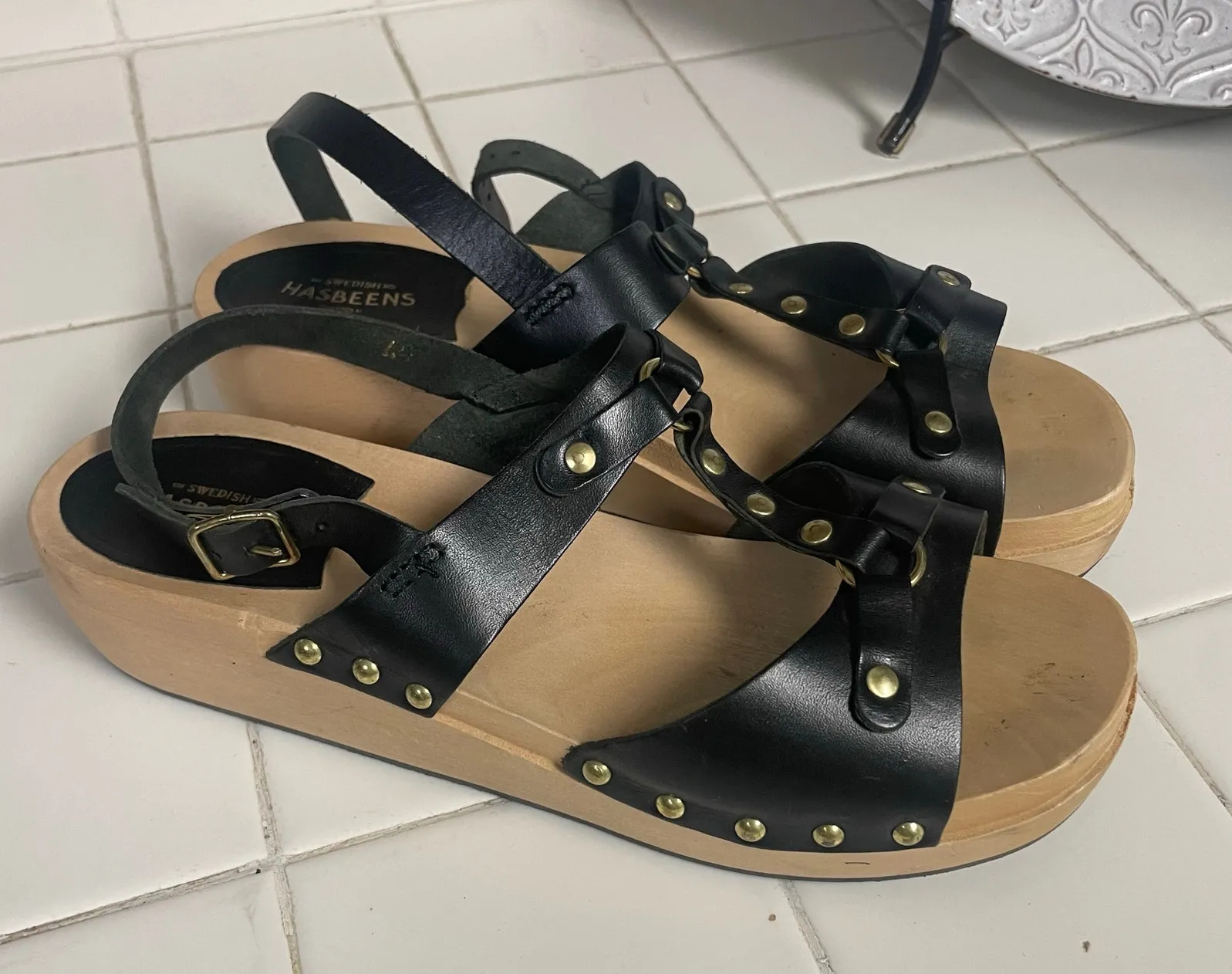New without box womens sizes 40 EU or US 10 black sandals in the style Rivet Adjustable buckle back strap with rivet detailing along the top, made from Italian leather with a wood heel