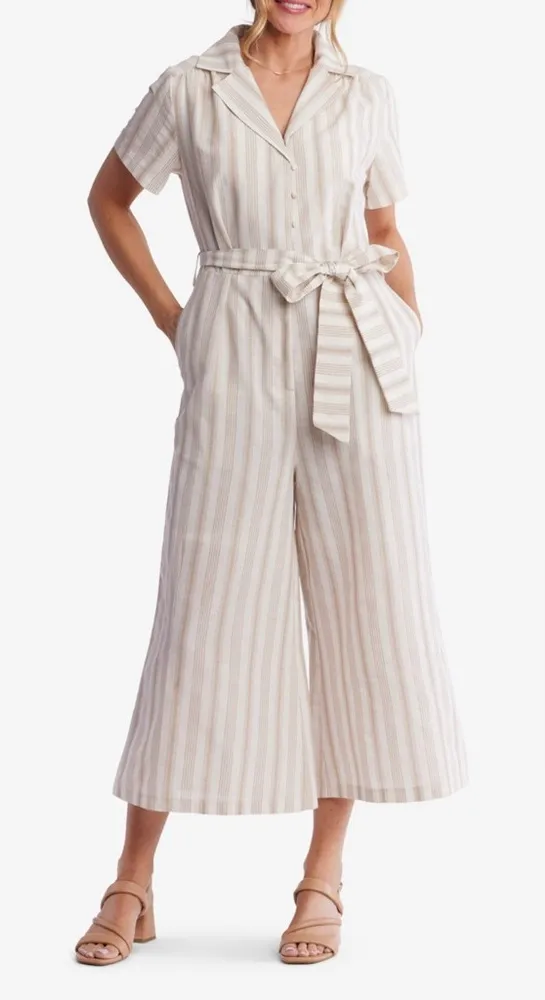 Sweet salt striped Jumpsuit women pockets button zipper tie short sleeve size L Size L Pre-owned Color Beige & light brown Pockets Light fabric Tie Zipper Button Not tag with material