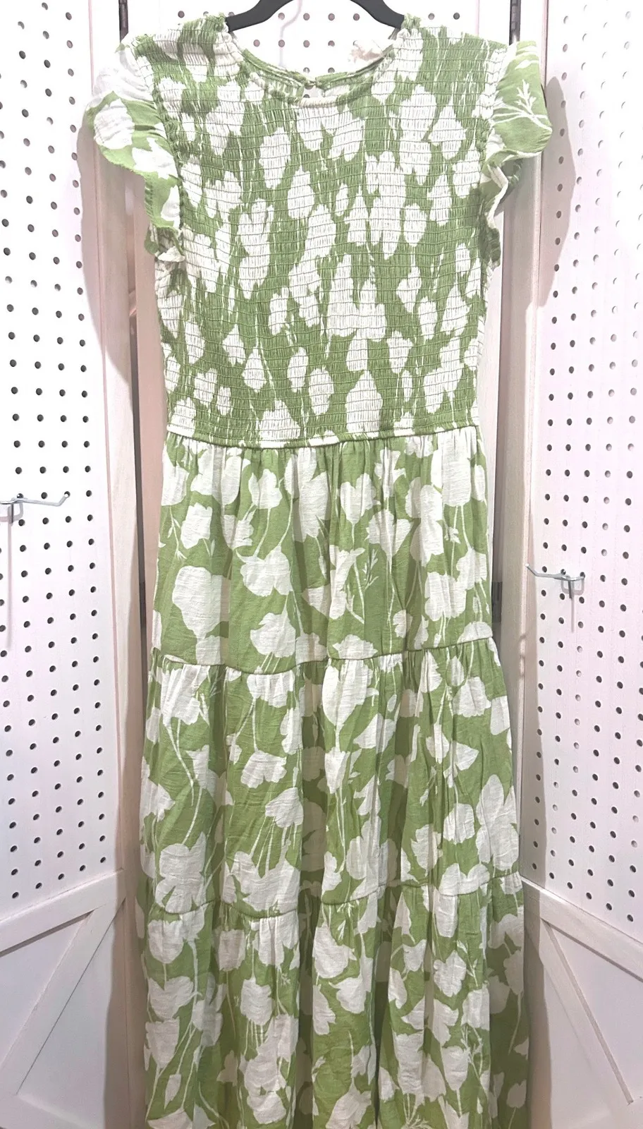 Sweet Wanderer green and white floral print maxi dress. This feminine dress features a smocked bodice for a comfortable and flattering fit, short flutter sleeves, and a tiered skirt for beautiful movement. Perfect for a casual day out, a garden party, or a beach vacation. Measurements: • Bust: 34 in • Waist: 28 in • Length: 50 in Style: Sundress, Maxi, A-Line Dress Length: Long Department: Women Sleeve Length: Short Sleeve Pattern: Floral Occasion: Casual Material: Rayon, Polyester Fabric Type: Rayon Theme: Flower, Tropical Neckline: Round Neck Season: Spring, Summer Sleeve Type: Flutter Sleeve Closure: Pullover Accents: Ruffle
