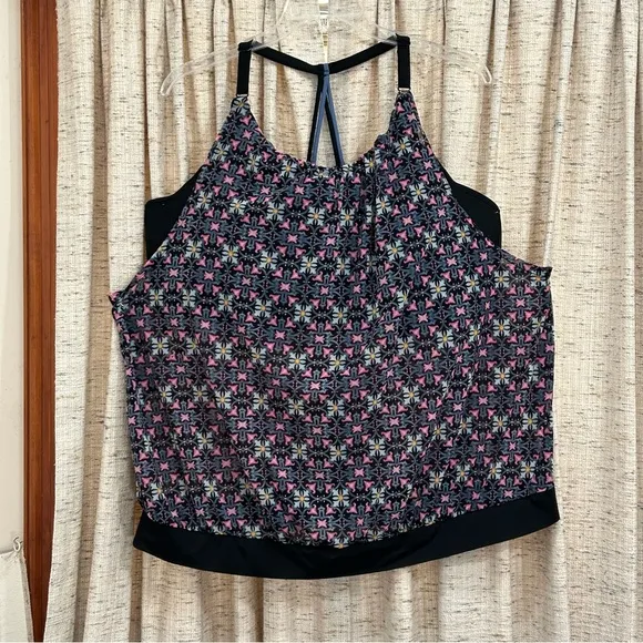 Brand: Cacique, Size: 28, Colors: Black, Gray, Pink, Adjustable straps, Built-in bra, Wire-free, Swim tankini top gathered at neckline and banded bottom, Good used condition *Comes from a smoke free and dog friendly home*