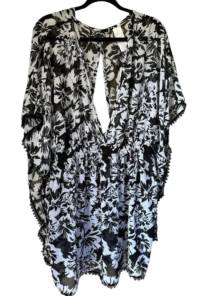Swim cover up NEW black white floral Time & Tru 2x 20w 22w batwing vacation - $18 New With Tags - From Adriana