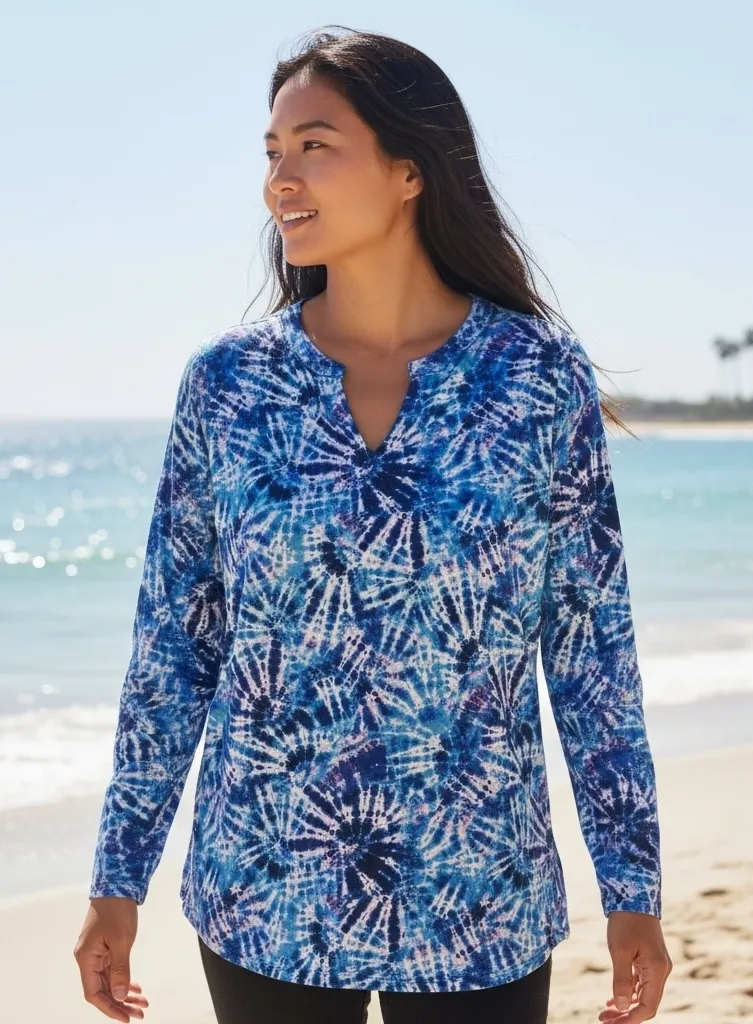 Brighten your wardrobe with this vibrant SWIM365 tunic top, a celebration of dynamic tie-dye artistry. The striking blue and white pattern evokes sun-drenched shores and carefree days, while the flattering V-neck and long sleeves offer versatile styling. Designed for comfort and ease, this top effortlessly transitions from a beach cover-up to a chic casual piece. Imagine wearing this on a seaside stroll, a weekend brunch, or a relaxed vacation getaway. Measurements: • Pit to Pit: 21" • Shoulder to Hem: 30" Type: T-Shirt Department: Women Style: Tunic Material: Polyester Blend Neckline: V-Neck Sleeve Length: Long Sleeve Sleeve Type: Casual Sleeve Pattern: Geometric Theme: Beach Features: Keyhole Neck Fit: Relaxed Fabric Type: Knit Occasion: Casual, Travel Closure: Pullover Season: Summer, Spring Keywords: tie dye, tunic top, long sleeve, v neck, blue white, women's fashion, casual wear, beachwear, resort wear, summer style, boho, relaxed fit, printed top