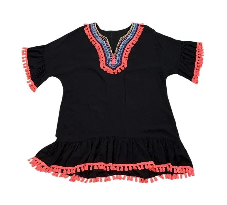 Swimsuit Beach Cover-Up Dress Black Embroidered Tassle Fringe Resort Travel LgGood gently pre-owned... Show more