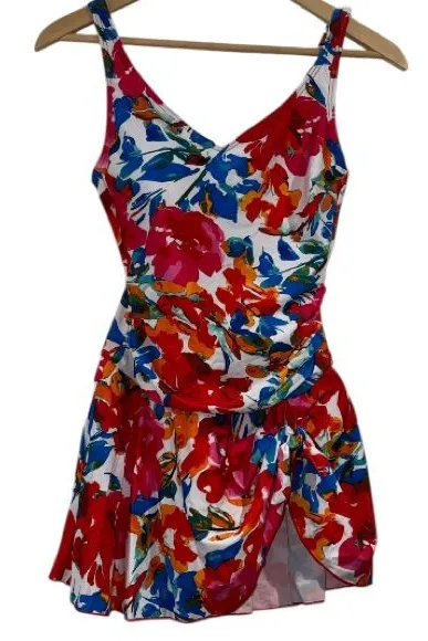Vibrant floral print swimsuit dress style with a mix of red, blue, and green colors. Perfect for a l... Show more