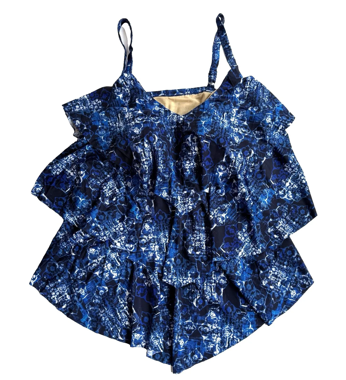Condition - New without Tags - no signs of use or wear. Please see all photos as they are part of the description. Brand: Swimsuits for All Women's Plus Size: 30 / 5X Color: Blue and White Style Name: V Neck Tiered Tankini Top Style Profile: Nautical, Beach, Batik, Classic, Modest Features: Built-In Power Mesh Bra with Foam Cup Liners (not removable) V Neck Ruffled / Tiered Design UPF 50 Adjustable Straps Nylon / Spandex Blend Made in China Hand Wash 1lb 3oz