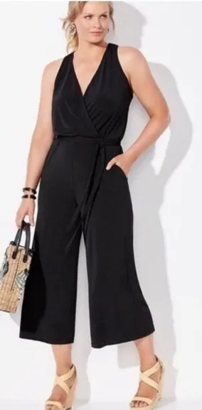 Swimsuits for All Ava Black Wide Leg Cropped Sleeveless Jumpsuit ~ surplice v-neck with snap closure ~ elasticized waistband ~ wide leg ~ stretchy knit ~ long armholes, will need cami or bralette ~ pockets ~ except condition! Size: 18/20 Inseam: 24” Rise: 14” Party lunch brunch vacation glam minimalist concert festival travel date night day to night