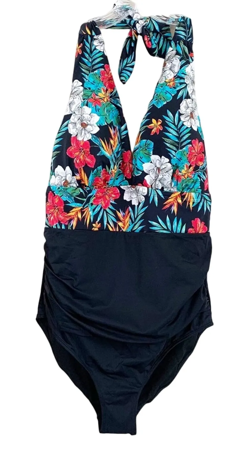 Size 16. 82% Nylon 18% Spandex. Length shoulder to the bottom 36 inches. Armpit to armpit 18 1/2 inches. Tummy control. Removable pads. Lined. Great condition! Stock picture to fit pattern differ from my version.