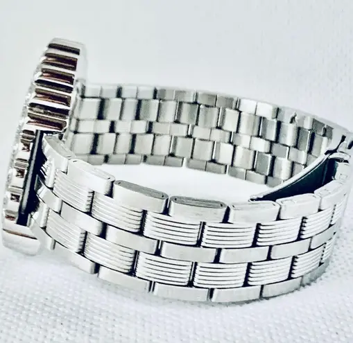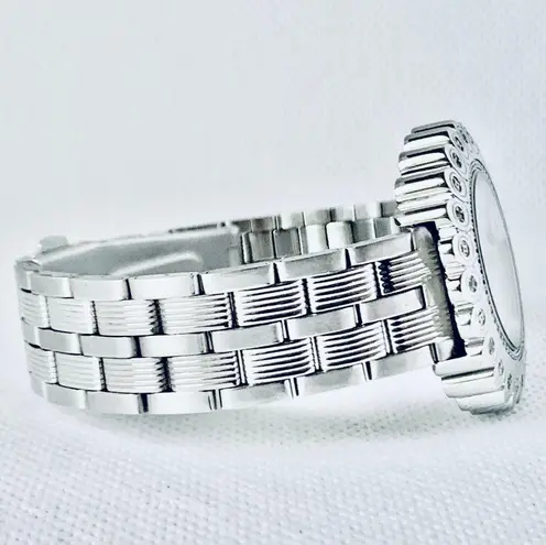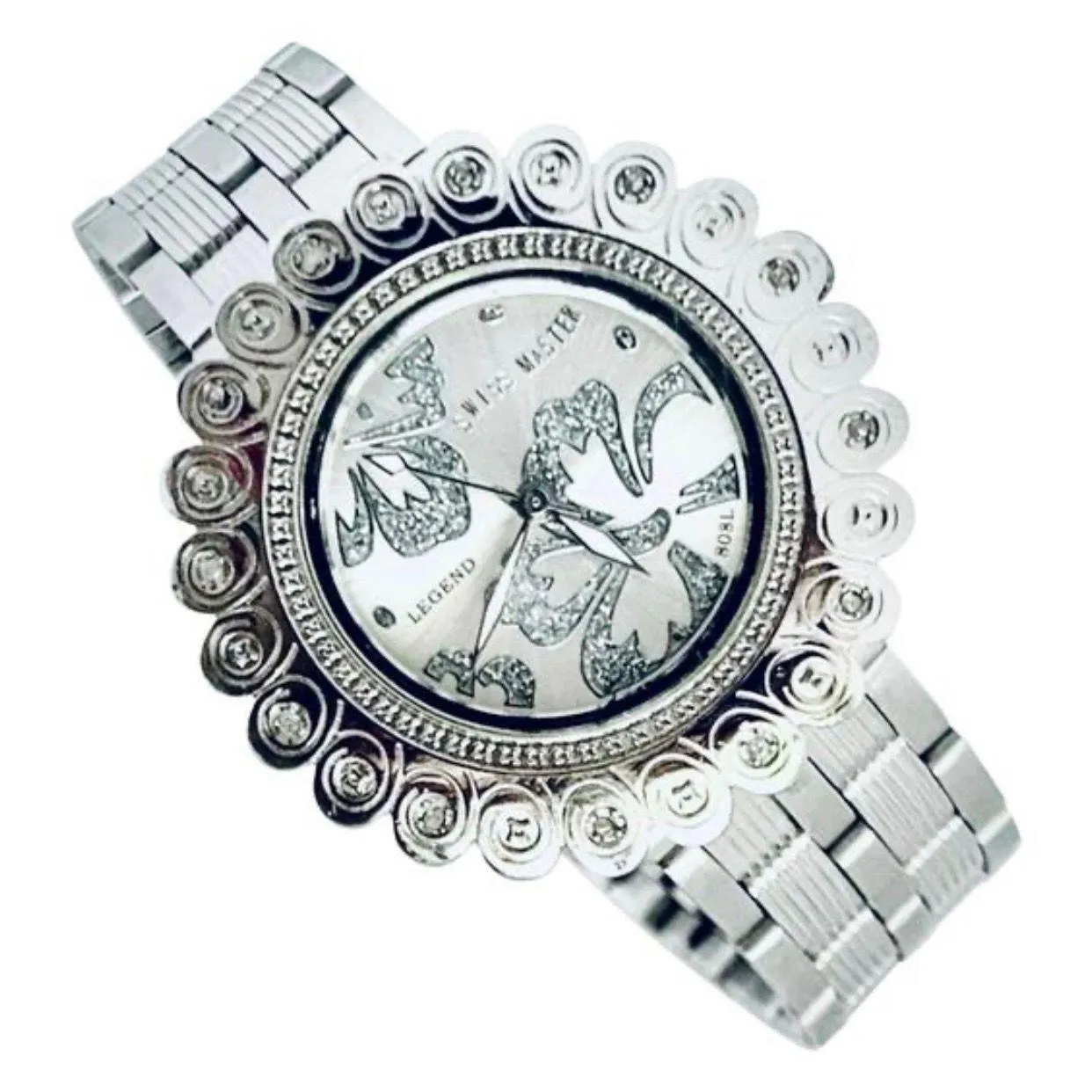 Swiss Master Legend Women's Watch #808L EUC w/minimal surface wear, crystal is perfect! Be sure to view all photos of the item & judge condition for yourself as opinions of condition can vary. New battery installed & working perfectly! 36mm, 8mm thick case w/a floral design accented with genuine diamonds & swirl-like engraving decorating the stationary bezel, a shiny silver dial w/glittery floral design & hour markers as well as silver-tone luminous hands. 15.5mm band, circumference of 7.5”