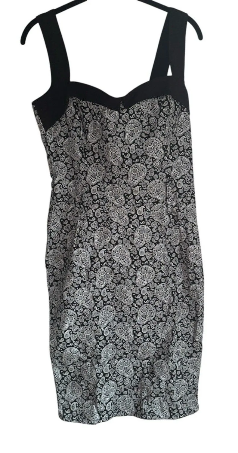 The product is a small-sized women's dress from the brand Switchblade Stiletto, featuring a black and white sugar skull pattern on a sleeveless, strappy sleeve design. The dress has a midi length and a zipper closure, making it suitable for various occasions such as parties, casual outings, or formal events. The dress is accented with a zipper detail, adding a touch of edgy style to the overall design, perfect for women who want to make a bold fashion statement with a unique skull theme. Switchblade stiletto pinup style dress Sugar skull dress Hot topic sugar skull dress Hot topic vintage skull dress The size tag does not have the tag but I believe this is a size small please read measurements to be sure. Approximate measurements laying flat Waist 14.5 Bust 16 Widest hip leg width is 17.5 Total dress length 33 This dress has belt looks but does not come with the belt. Preowned. Smoke free