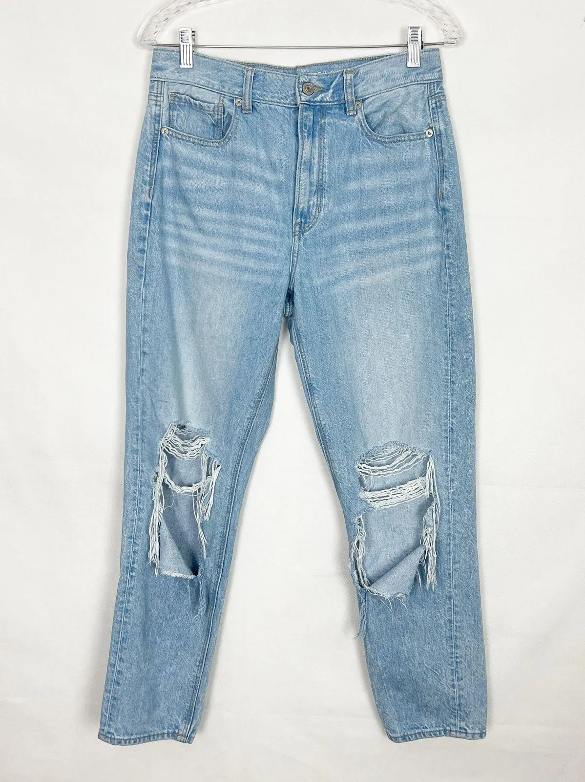 American Eagle Mom Jeans. High-rise. Metal button and zipper closure. 5-pocket. Belt loops. Distress... Show more