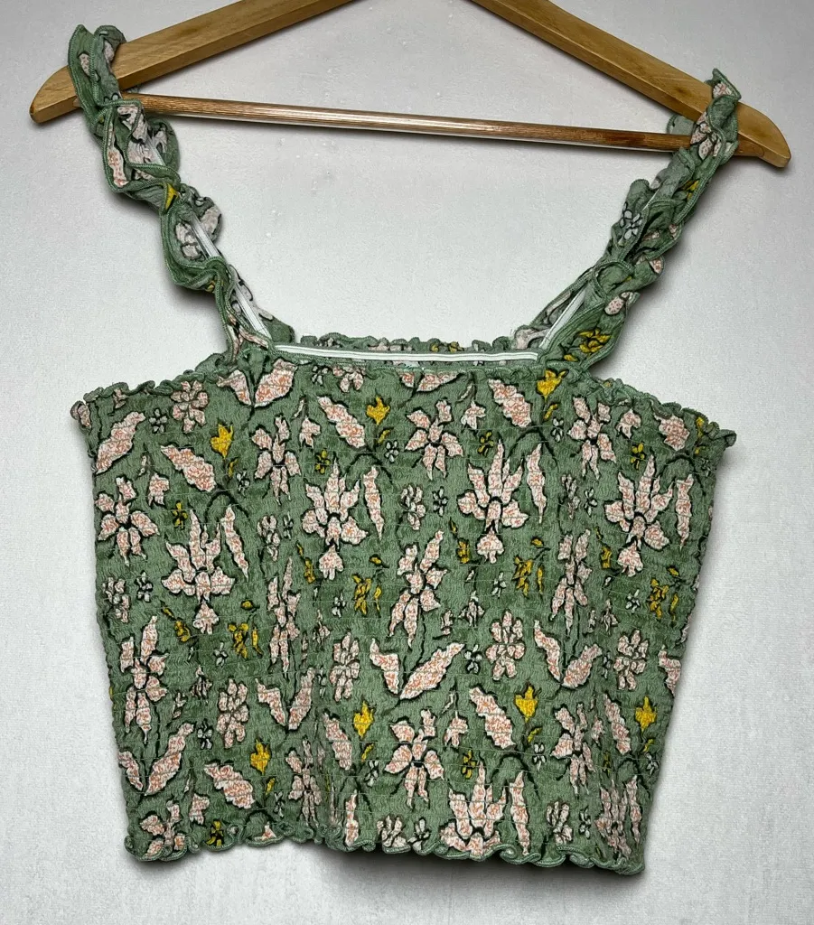 Textured green tank with floral design. Features ruffled straps. Ideal for casual wear.