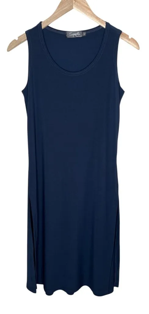 Excellent preloved condition Sympli Sleeveless Navy Blue Side Slit Midi Tank Dress Size 6 Minimalist • Sleeveless • Midi length with side slits • Pull-on style • Lightweight fabric Length top to bottom = 40 inches, armpit to armpit = 19 inches. Smoke Free home Feel free to make an offer