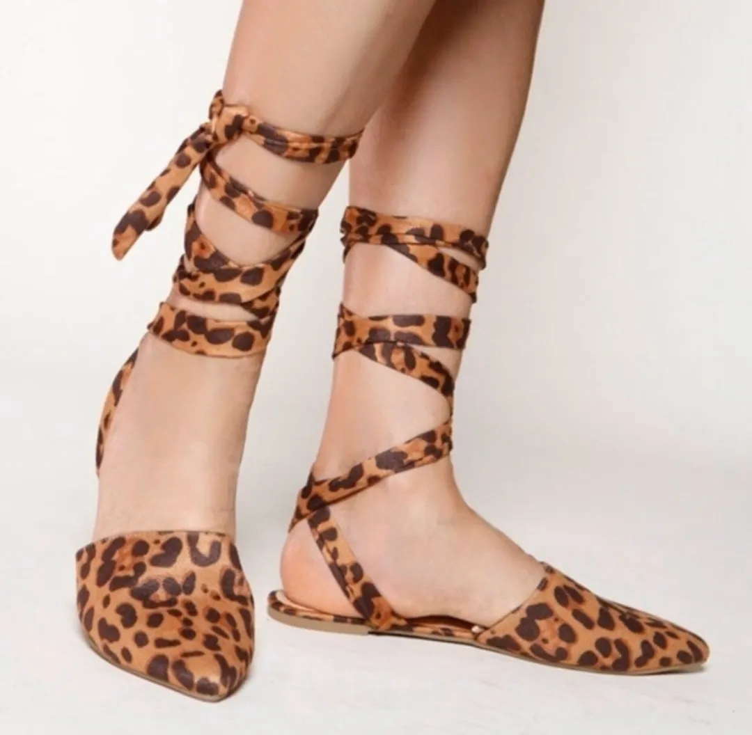 Leopard Lace Up/ Wrap Around Ballerina Flat (Reagan) lace-up closure flat sole suede material runs true to size Brand: Charlotte Russe Product does not come in box, will be shipped in Polybag