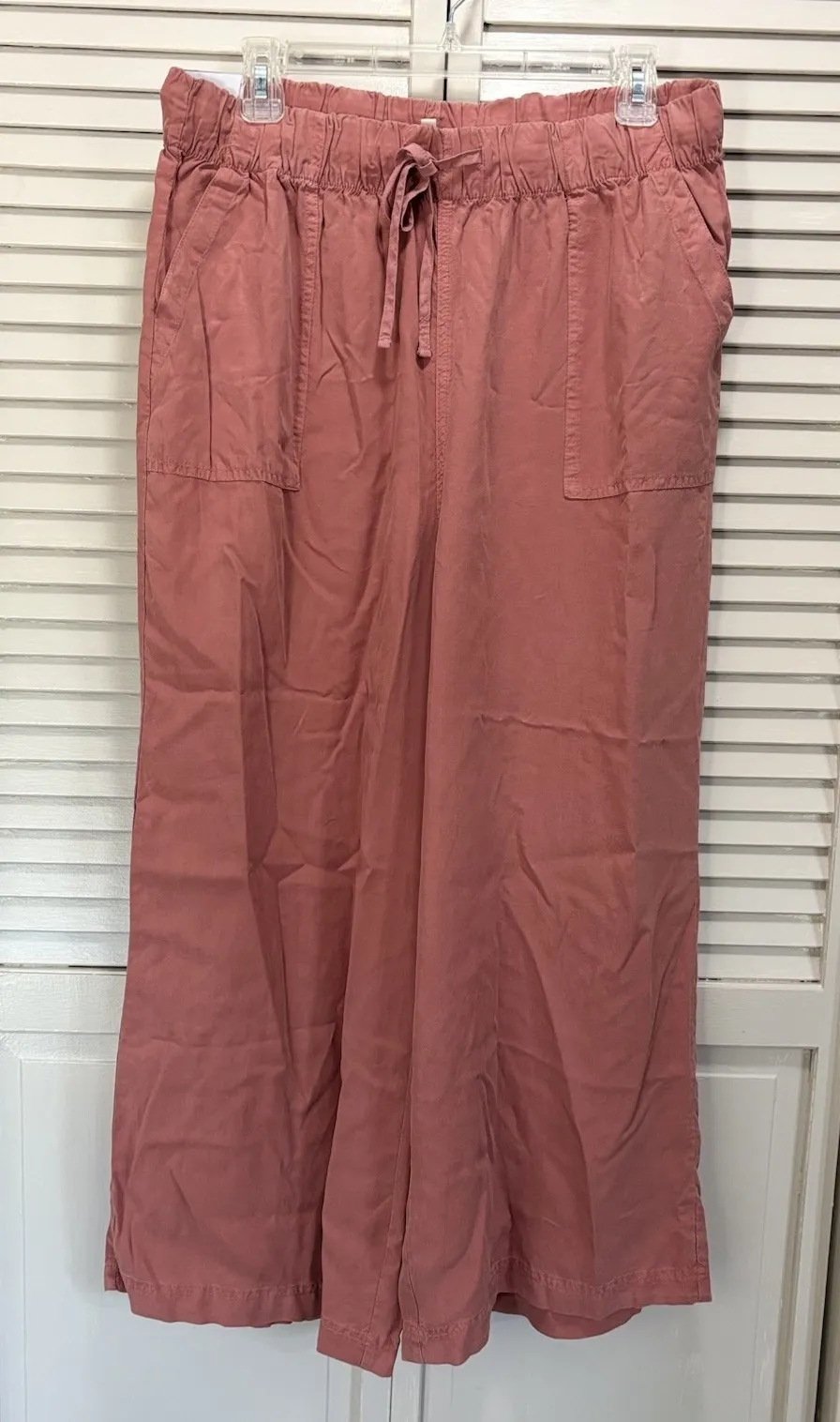 These T & S wide leg mauve relax fit pants in size 2XL feature an elastic waist and high rise at 14", pockets, making them both comfortable and stylish. The breathable lyocell fabric and wide leg crop style make them perfect for casual occasions or travel during any season. The relaxed fit and elastic waist at 30" ensure a comfortable and customizable fit, while the 23-inch inseam, 13" leg width and flat front add to the overall stylish look. With a tie waist accent and hippie/bohemian theme, these pants offer a trendy and cozy option for women's wardrobe. (B966)