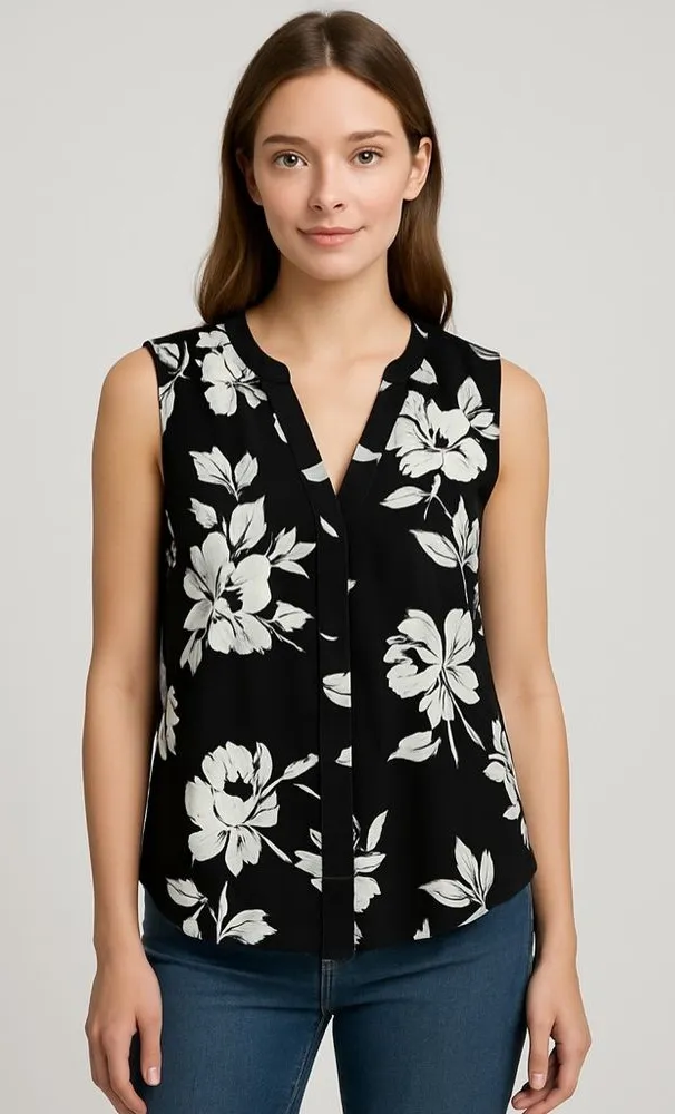 Chic and versatile, this T Tahari women’s sleeveless blouse (Size XS) features a black and white flo... Show more