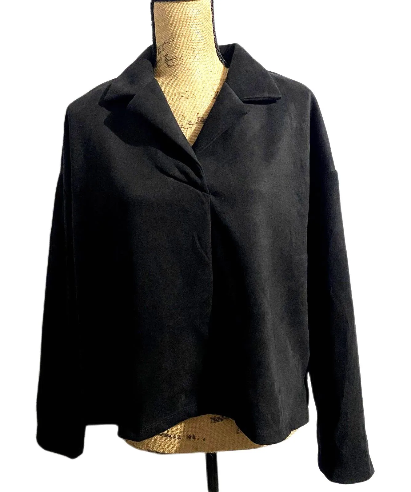 T Tahari Faux Suede Popover Blouse Black Collared Shirt Boxy Fit Size Large Gently used condition w... Show more