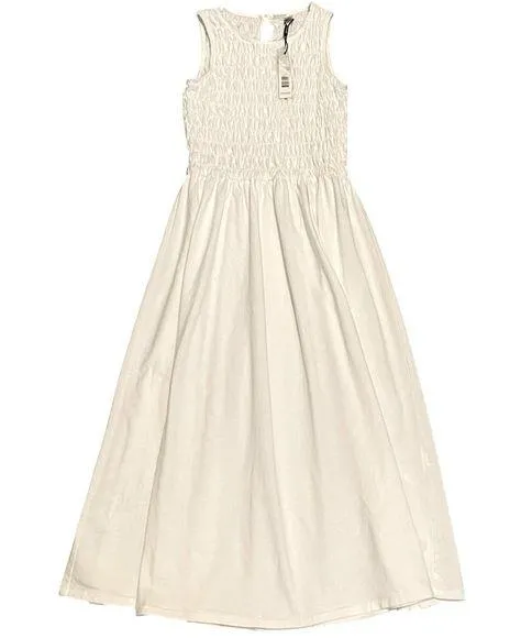 The Tahari sleeveless smocked bodice has a rounded neckline. The skirt is a full A-Line style. The dress is pullover style with a button closure at the back keyhole opening Condition: New with Tag Material: 100% Cotton Approx Measures: Length 41” Pit to Pit 13” Pit to Pit Stretch 15” Waist 12” Waist Stretch 14” *All measurements are taken with garment laid flat Ships same or next business day