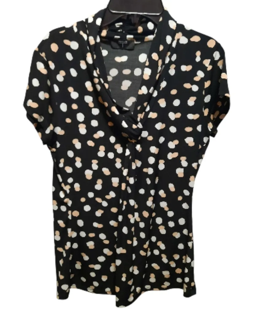 . The blouse is 95% Polyester and 5% Spandex. Machine washable. Multicolored. The color of the blouse is Black, White, and Tan. Vneck. Twist Knot Front Neckline. Business Casual. Soft. Stretchy. Smooth feeling. The blouse shows signs of normal wear. Please see pictures for more details. Polka Dot. With the garment laying flat, the measurements are as follows: armpit to armpit is 17 1/2 inches and from back of the neck to bottom of the blouse is 26 inches. Preowned but in good condition.