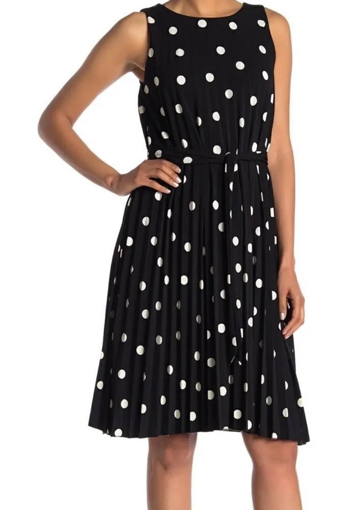 T Tahari Pleated Polka Dot Tie-Waist Dress Classic pleated detail and a modest crew neck make this gorgeous polka dot printed dress a go-to for fancy occasions-Think Pretty Women - Crew neck - Sleeveless - Back button loop closure - Slip on overhead - Removable tie waist - Printed - Pleated detail - Lined