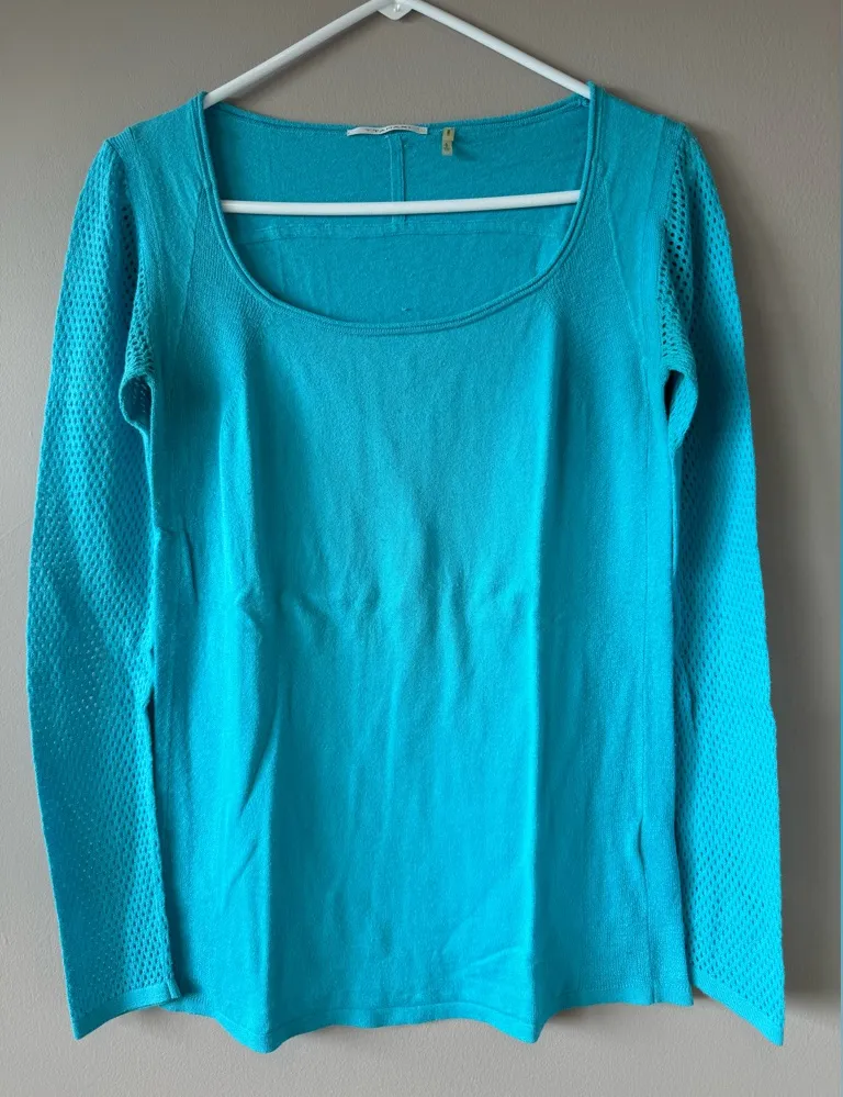 Tahari Women’s Sea Blue Cashmere/Cotton Blend Long Sleeve Top -Size S -96% cotton, 4% cashmere -open weave sleeves -gently used, great condition; there is a small snag in the fabric (pictured) may be able to be pulled through From pet and smoke free home. Keyword tags: T Tahari vintage long sleeved top cotton cashmere stretch chic style fashion women’s top casual small S retro Y2K 90s festival party basic neutral colorful bright soft work corporate party