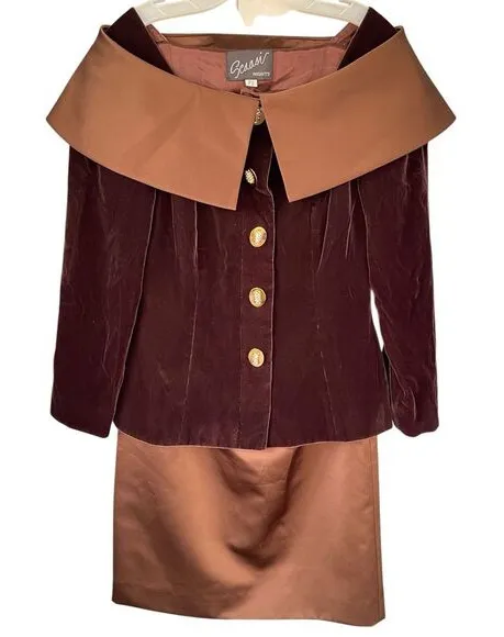 T2 90s Vintage Arnold Scaasi Women's Velvet Velour Satin 2Pc Jacket & Skirt Suit Set Brown Size 8 A luxurious velour jacket with an elegant off-shoulder contrast collar overlay and long sleeves. The jacket is adorned with eye-catching gold-tone bling buttons and a button front closure. The coordinating midi skirt boasts a pleated front, hidden back zipper with hook and bar closure, and a center back slit for added movement. Brand: Arnold Scaasi Nights Department: Women's Size: 8 Color: Brown Style: Jacket and skirt set Fit: Regular Closure: Button/Zip Neckline: Off shoulder shawl collar Sleeve Type: Classic Sleeve Sleeve Length: Long Sleeve Pattern: Solid Material: 65% Acetate, 35% Rayon | Lining: 100% Acetate Condition: Pre-Owned Approximate Measurements: Blazer Pit to pit: 19" Length: 25.5" Skirt Hips: 20" Waist: 14" Length: 24" T2