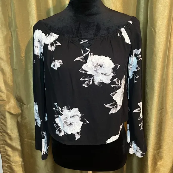 KENDALL & KYLIE Black Floral Long Sleeve Off the Shoulder Crop Top size medium