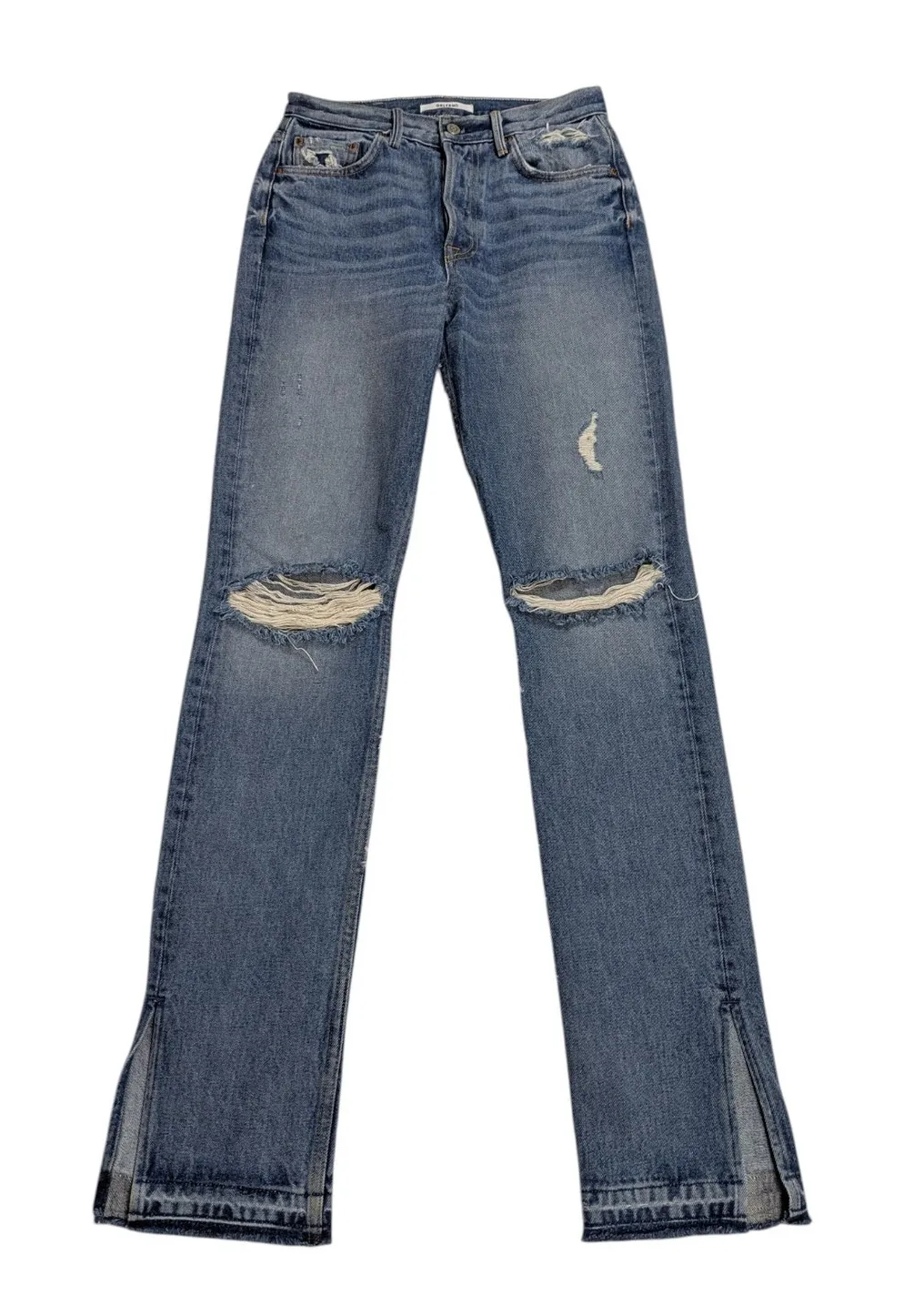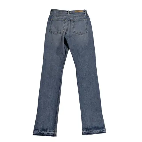 Classic GRLFRND “Natalia” jeans in light wash denim with a high-rise, straight-leg fit. Features distressed knees, frayed hems with side slits, and 100% cotton non-stretch denim for that authentic vintage feel. Made in the USA from premium domestic fabric. Measurements (approx): Waist: 14” flat Rise: 11” Inseam: 34” Size: 27 Excellent used condition high waist jeans straight leg jeans vintage-inspired denim classic straight jeans raw hem jeans side slit jeans 90s style jeans off-duty model jeans