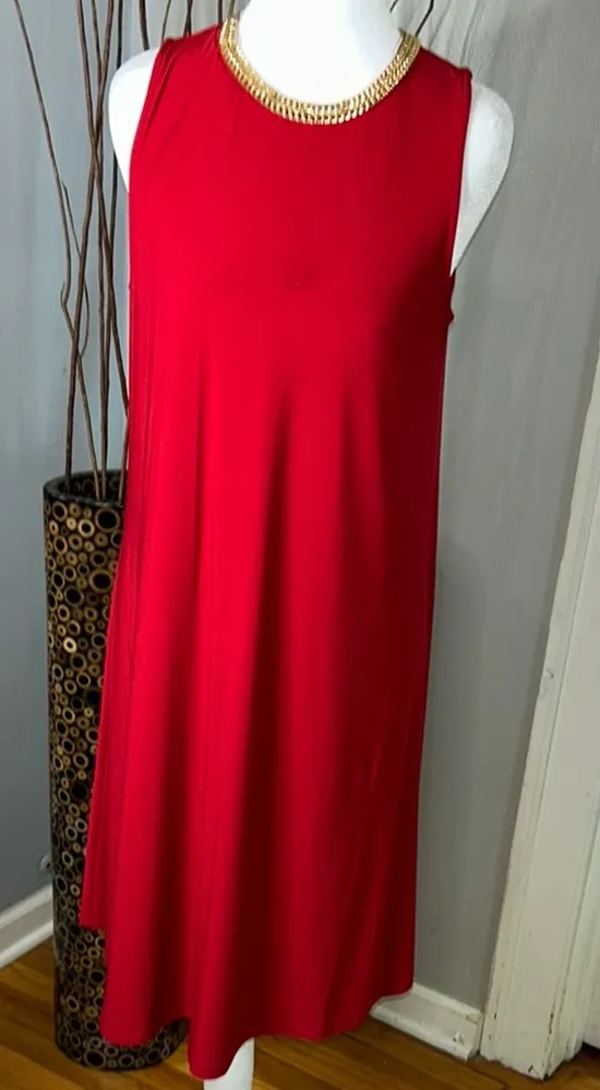 This stunning red sundress by Nina Leonard is perfect for a wedding guest or a night out. Featuring a sleeveless design and a classic crew neckline, it offers a relaxed and flowing silhouette that falls to a flattering midi length. Its simple elegance makes it a versatile addition to any wardrobe.