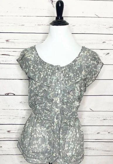 LC Lauren Conrad Gray Floral Ruffle Blouse Top Size Large Ditsy Floral Pattern with pastel yellow, t... Show more