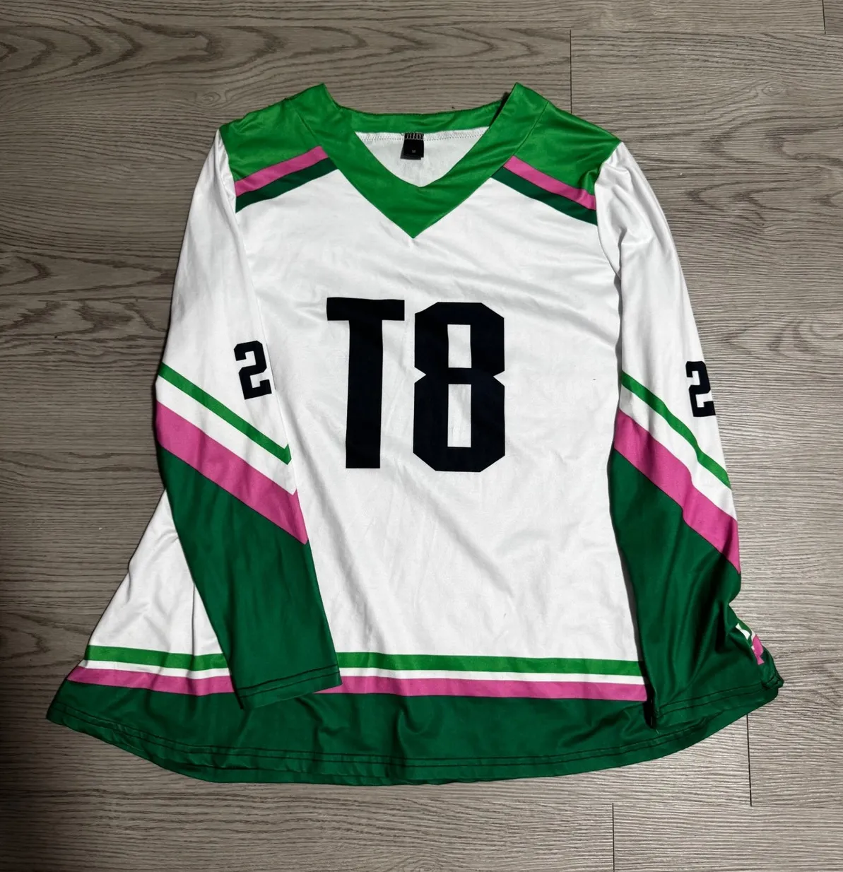 Distinct sports-inspired shirt adds a playful twist to your casual wardrobe. Sporting a vibrant color palette with bold green and pink accents, this white top features a unique "T80" design and a comfortable V-neck. Perfect for adding a touch of sporty flair to your everyday outfits, whether you're heading to a casual brunch with friends or enjoying a laid-back weekend at home. Keywords: Jersey shirt, Long sleeve top, Sporty top, Casual shirt, White shirt, Green pink shirt, T80 shirt, Athletic top, Medium shirt, Womens top, Fashion shirt