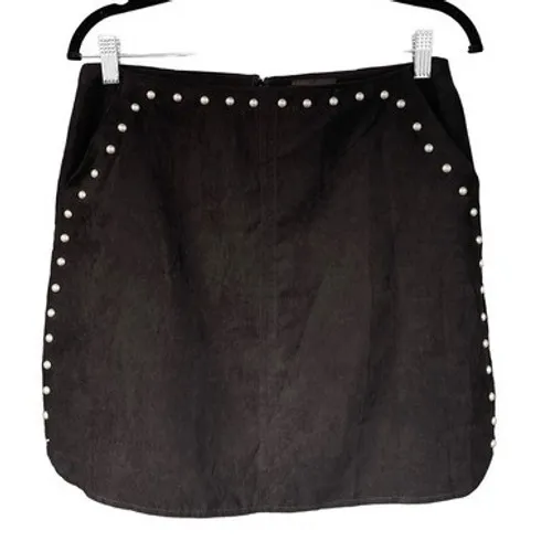 T8 Y2K 2000s Vintage Command attention with this striking Lumiere mini skirt, a chic blend of edgy studs and luxurious faux suede. The polished silver-toned studs trace the contours of this skirt, adding a touch of glamour and highlighting the flattering silhouette. Imagine the confidence you'll feel as the soft faux suede drapes beautifully, creating a sleek and modern look. This versatile piece transitions effortlessly from a night out with friends to a sophisticated brunch date. Type: Skirt Style: Mini Skirt Length: Short Department: Women Material: Suede, Polyester Pattern: Solid Accents: Studded, Beaded Fabric Type: Velvet Features: Pockets, Lined Closure: Zip Occasion: Casual, Party/Cocktail Season: Fall, Spring, Winter Garment Care: Dry Clean Only Country of Origin: China Unit Type: Unit Keywords: Lumiere skirt, mini skirt, studded skirt, faux suede, edgy, glam, night out, brunch, fashionable, chic, modern, statement piece, fall fashion
