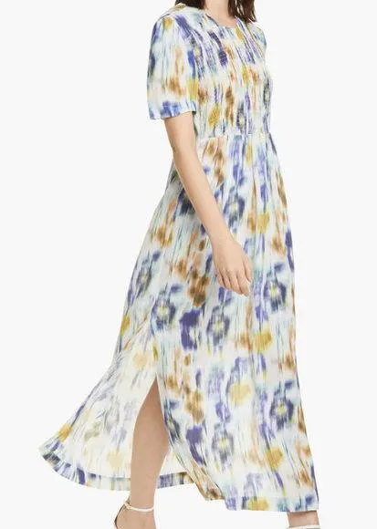Dance Admaris Tie Dye Smock Bodice Stretch-silk Maxi A-line Dress In White Blue Floral Blur Great pre-owned condition, no flaws noted Size 36, (US 4/6) Armpit to armpit about 16” Length about 52” longest length Color name: White Blue Floral Blu Tie Dye effect Midi, A-line silhouette Top part is smocked so it’s stretchy Two side slits Bottom is partially lined Short sleeve with button accent back of sleeve Viscose, Silk A smocked bodice creates a close-to-the-body silhouette on this playfully chic dress, while deep side slits add flowy movement to the gathered skirt Back keyhole with button-and-loop closure Jewel neck Machine wash, line dry *NO Returns for tags: designer, contemporary, colorful, artsy, art, trendy, trend, tie dye, pattern, silk blend, business casual, wedding, event, party, celebration, midi, blue, sophisticated, classy, classic, luxury