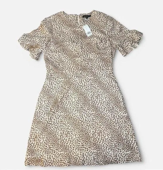 This is a Banana Republic dress in size 8 with a leopard print pattern. It features ruffle bell slee... Show more