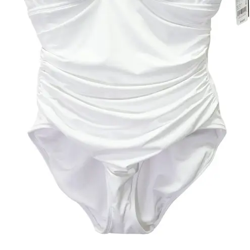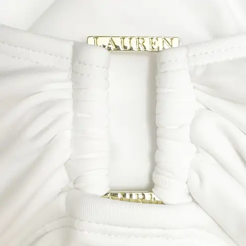 Sleek and timeless, this white one-piece by Lauren Ralph Lauren offers a flattering silhouette with shaping support. Designed with a gold-tone “Lauren” engraved rectangular ring at the bust, it features delicate shirring and a hidden underwire for subtle lift. The scoop back and full seat coverage offer comfort without sacrificing style.