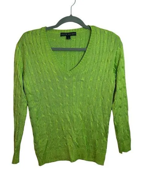 Pre owned like new. Absolutely gorgeous electric green cable knit v-neck sweater. This is so soft an... Show more
